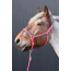 Luxe gevoerd nylon halster op neus en hoofdband met zware fournituren. Halster is versierd met siersteentjes op neus, bakstukken en hoofdband. Halster is op 2 plaatsen verstelbaar